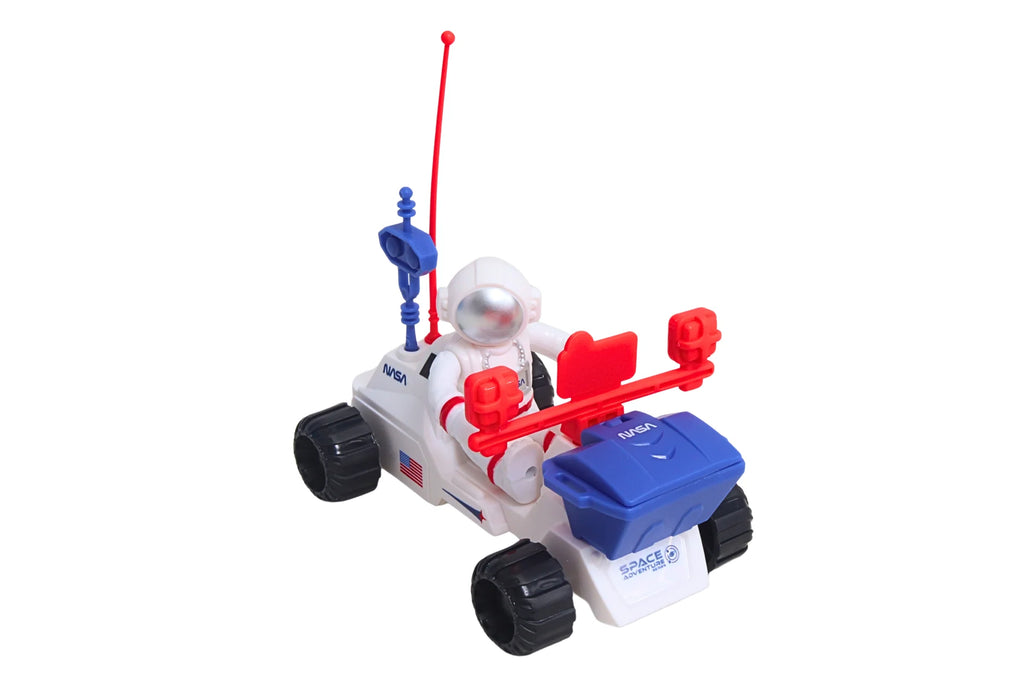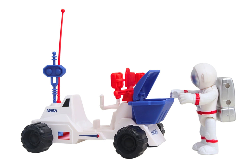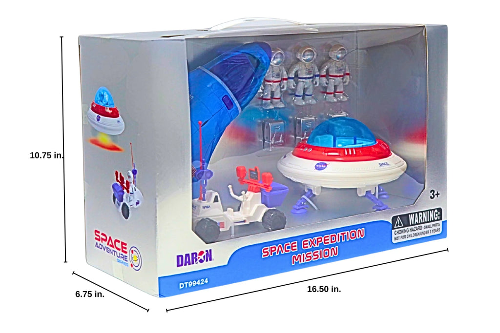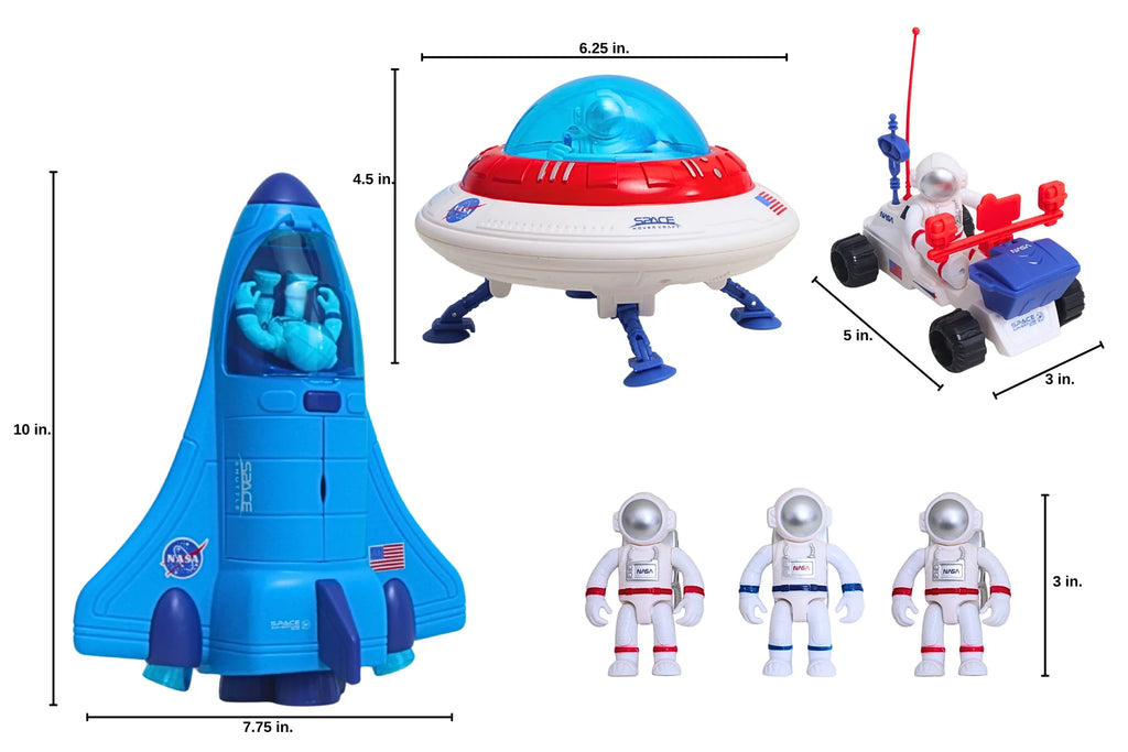 Kids can blast off to adventure with this space-themed playset that rockets them into a world of wonder and discovery! This plastic set comes complete with a space shuttle, hovercraft, space buggy, and astronaut figures. The set is loaded with special features, including lights and sounds that activate at the push of a button on both the space shuttle and space pod, windshield domes that can be opened so figures can sit inside the shuttle and pod, and an extendable mechanical arm inside the shuttle which can attach to a figure. Spin the astronaut around and imagine he is exploring and discovering the galaxy around him! Sounds include take-off effects for the shuttle, and an alarm for the space pod. The bay doors on the side of the shuttle open, and the space buggy features a storage box in back which can also be opened. All spacecraft and vehicles are freewheeling. Kids can roll the space buggy along for any adventures they can imagine! Adding to the fun and authenticity are licensed NASA logos and the American Flag adorning the pieces. Recommended for children Ages 3+.