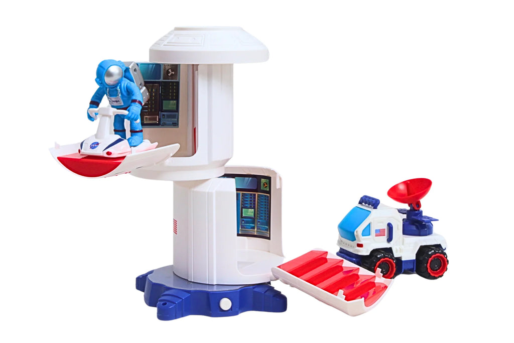 Kids can blast off to adventure with this space-themed playset that rockets them into a world of wonder and discovery! This plastic set comes complete with a space station with a capsule featuring two compartments, a free-wheeling space rover vehicle, a hover scooter, and a poseable astronaut figure. The set is loaded with special features, including lights and sounds that activate at the push of a button on the base, and the space capsule segments open up to reveal control rooms inside. When kids flip the doors and swivel the pieces, they can pull down a staircase for the astronaut or set up a landing pad for the hover scooter. The poseable figure can be placed inside the compartments and can also ride atop the space rover, and rotate around the top of the capsule pieces. Kids can roll the vehicle along for any adventures they can imagine! Adding to the fun and authenticity are licensed NASA logos and the American Flag adorning the pieces, and the space rover is outfitted with a satellite dish just like the real thing. Recommended for children Ages 3+.
