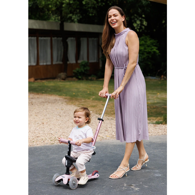 Stage 3: By moving the seat/T-bar combo to the Mini scooter base, kids can take their first ride on wheels—rolling forward while a parent provides support with the push bar.